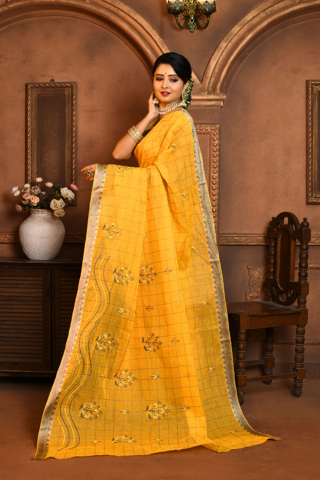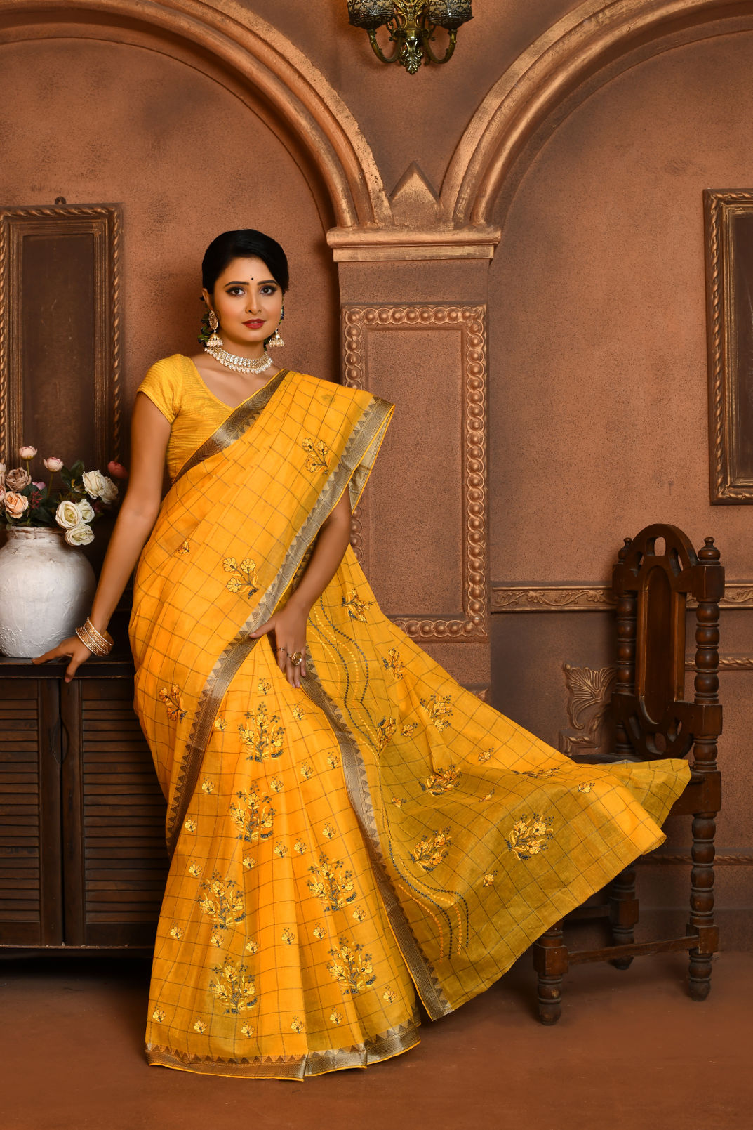 This saree is specially designed for those who have a penchant for rich embroidery. The mustard yellow saree in sheer net is intricately designed with shine gold mix thread work, that gives the illusion of floating flowers. Match it with a crystal earrings to look impeccable!