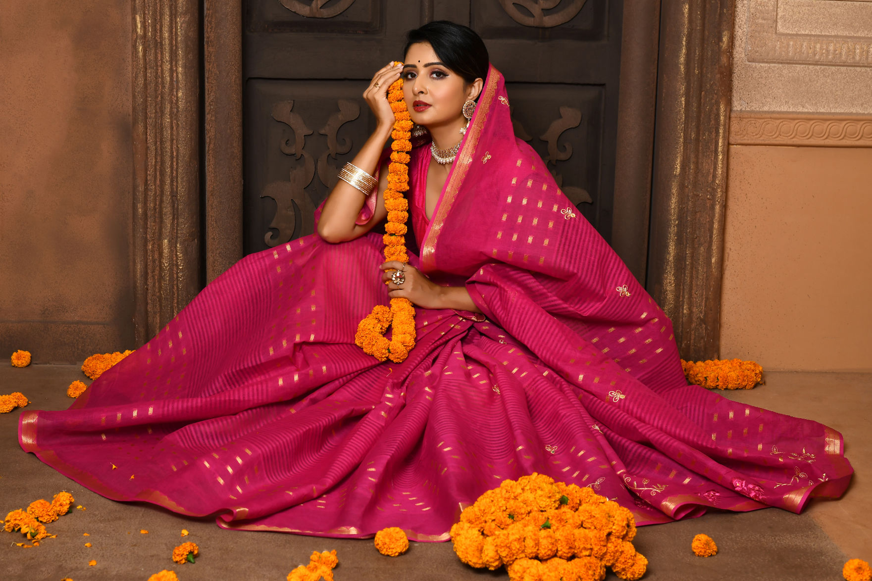 Here is a beautiful saree that spots the dark pink color. The trend of embroidery fashion that this saree follows in the border portion is something that will impress most people in the first place. This is one of the best embroidery sarees.