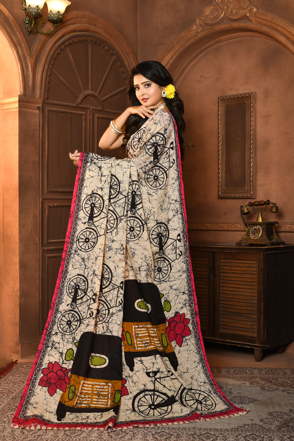Pure cotton based eye catching Printed all over with a combination of thin border and floral pattern , that makes you looks too beautiful.